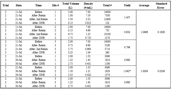 Table 5. Average yield of oysters in experimental silos during Trial 2 (July 11, 2025 – July 30, 2025). Data with an asterisk (*) represent invalid results