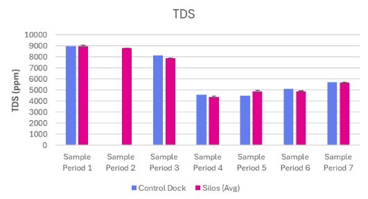 TDS concentration (ppm) was measured at a Control Dock (n=1) and Silos (n=3) over seven sampling periods (June 13, 2025 – July 25, 2025). Blue bars represent the control dock measurement. Pink bars represent the average of three silo measurements. Data is presented as average + standard error (SE).