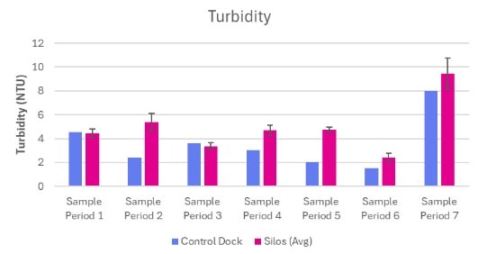 Turbidity (NTU) was measured at Control Dock (n=1) and Silos (n=3) over seven sampling periods (June 13, 2025 – July 25, 2025). Blue bars represent the control dock measurement. Pink bars represent the average of three silo measurements. Data is presented as average + standard error (SE).