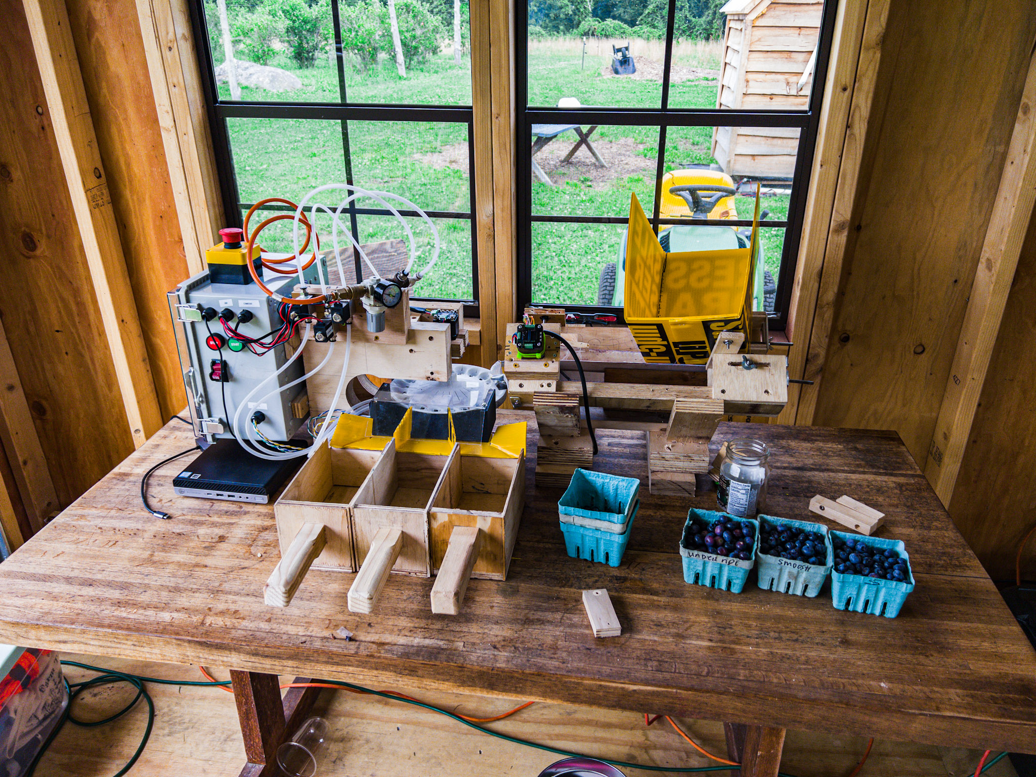 We worked at the farm in parallel with the human-powered sorter. One interesting feature of this process: Most machine learning programs are trained on data scavenged from the internet. In our case we trained the software on photographs of human-sorted blueberries– the blueberries themselves. After the prototype sorted the blueberries, we passed them back to the human sorter for re-sorting. The “mistakes” the computer made could then be re-submitted to the computer as training data, thereby improving the program’s accuracy. We found that we could also improve the program by re-submitting different photos of the same blueberries already classified by the human sorter. In this “leap-frog” learning method, we urged the computer to improve.