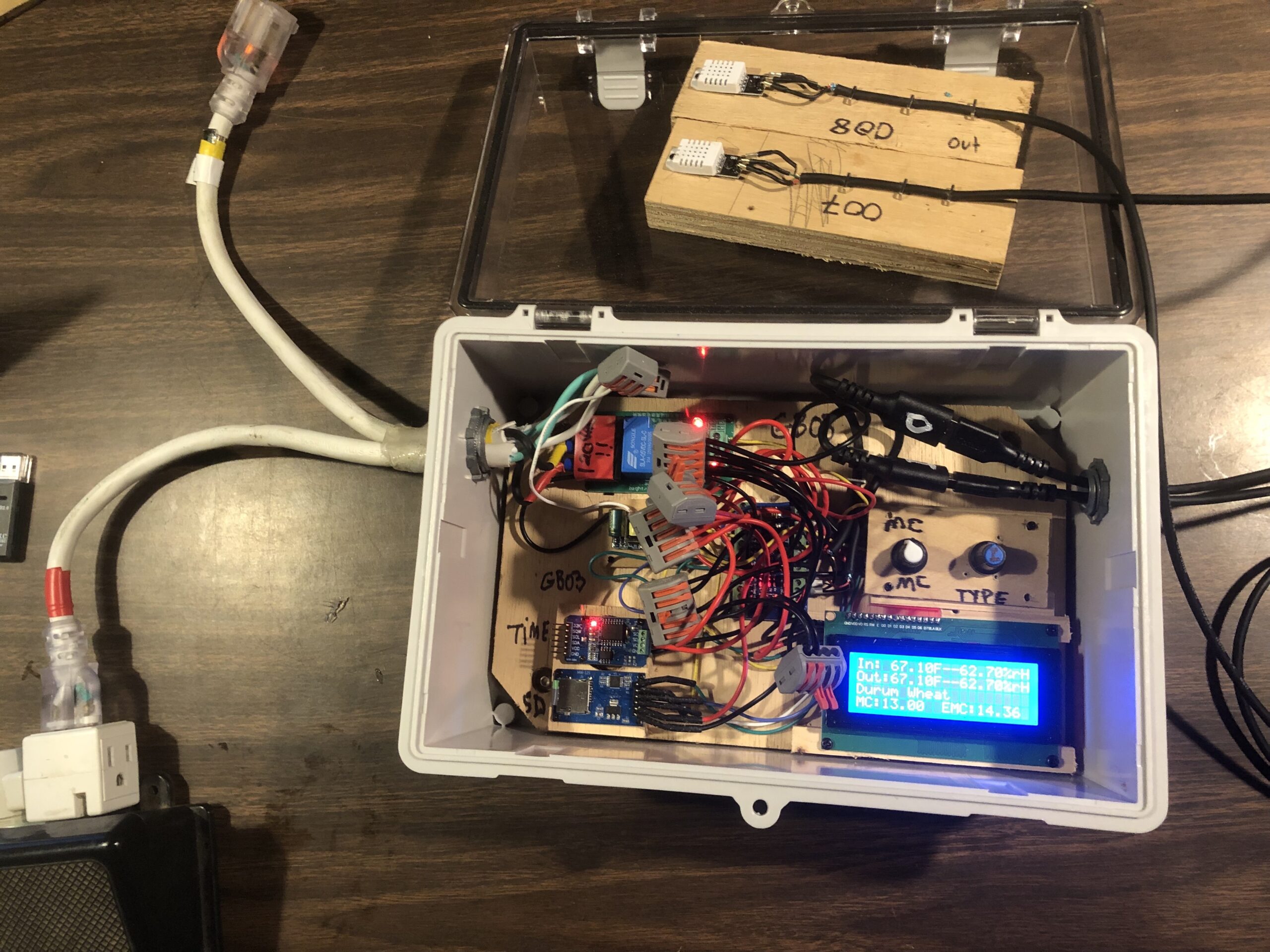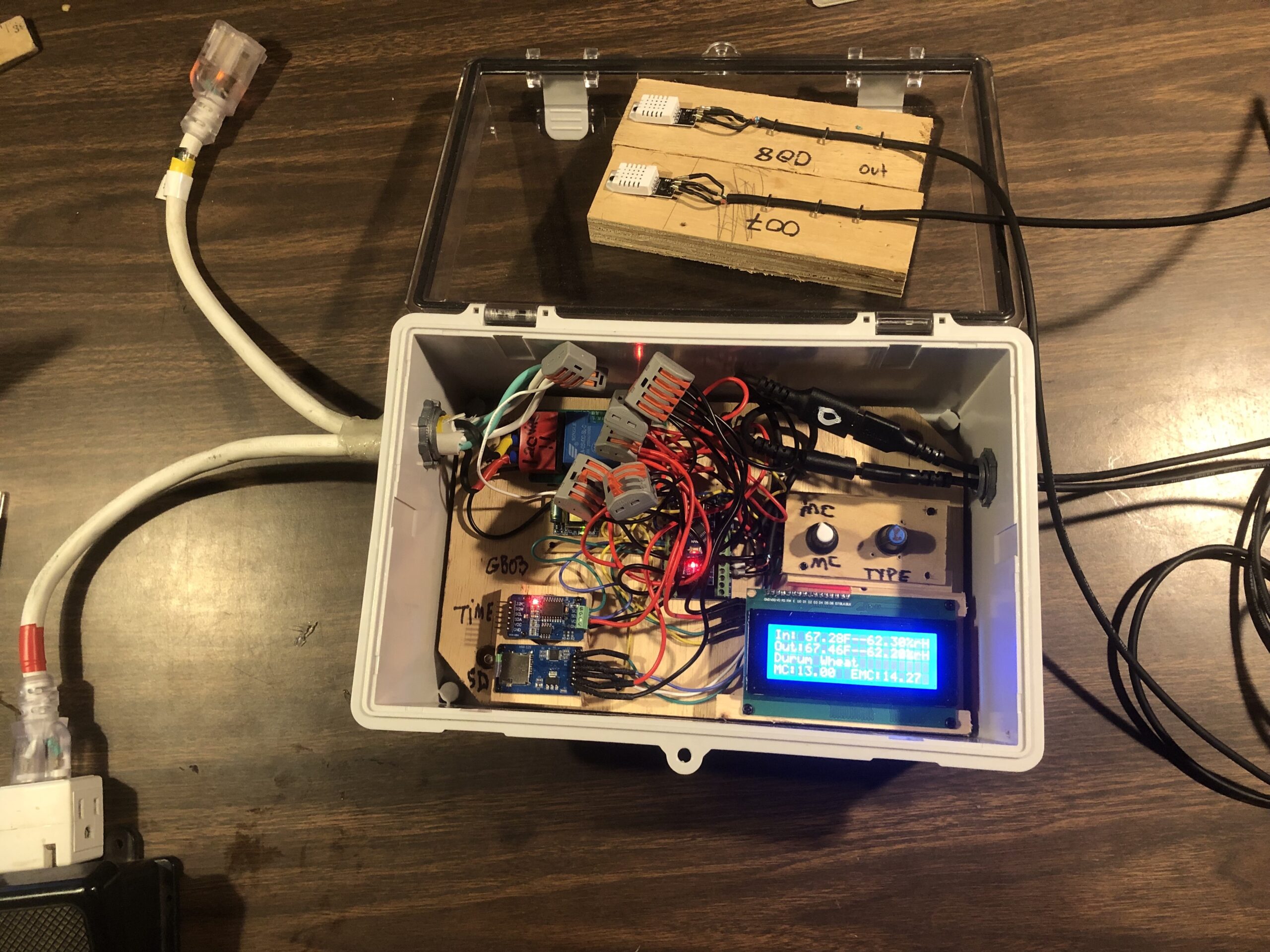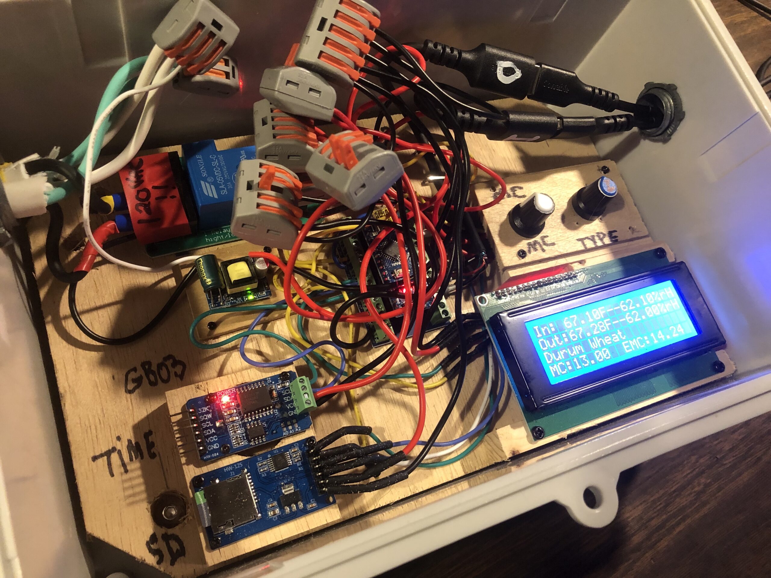 In March 2025 I built a “test tower”, essentially a miniature plenum drier for grain. The test tower was designed to dry a few pounds of grain but mimic the static pressure and airflow rates per pound of a standard plenum dryer. The test tower allowed me to moisten and dry the same few pounds of grain (in this case Wharthog Wheat grown in Essex MA) again and again while testing different Grainbrain electronics and code. The test tower worked well, and it allowed me to quickly test, calibrate, and modify Grainbrain electronics and code. I also had valuable input and suggestions from 3 farmers: Chuck Currie of Freedom Foods Farm (the participating farmer for this project), Noah Kellerman of Aprilla Farm (whose complaints about plenum drying led to the original prototypes), and Rob Eckman of Crabapple Farm. I wrote new code for these prototypes, using the blueprint created by Anni Schmidt, but using an architecture of functions that many people think is easier to follow and understand for non-computer scientists. I also added several features to the overall design, with help from James Davis: 1. A clock and datalogger so the farmer has a log of the “dry” and can analyze how long the grain spent at various moisture contents (MCs), how long the blower was running, and what the various weather conditions were. 2. A set of equations that calculate the Equilibrium Moisture Content (EMC) for various grains, temperatures, and relative humidities. 3. A LCD that displays real-time data. And, 4. A method for the farmer to periodically enter the actual grain MC as tested by the farmer with a grain moisture tester.