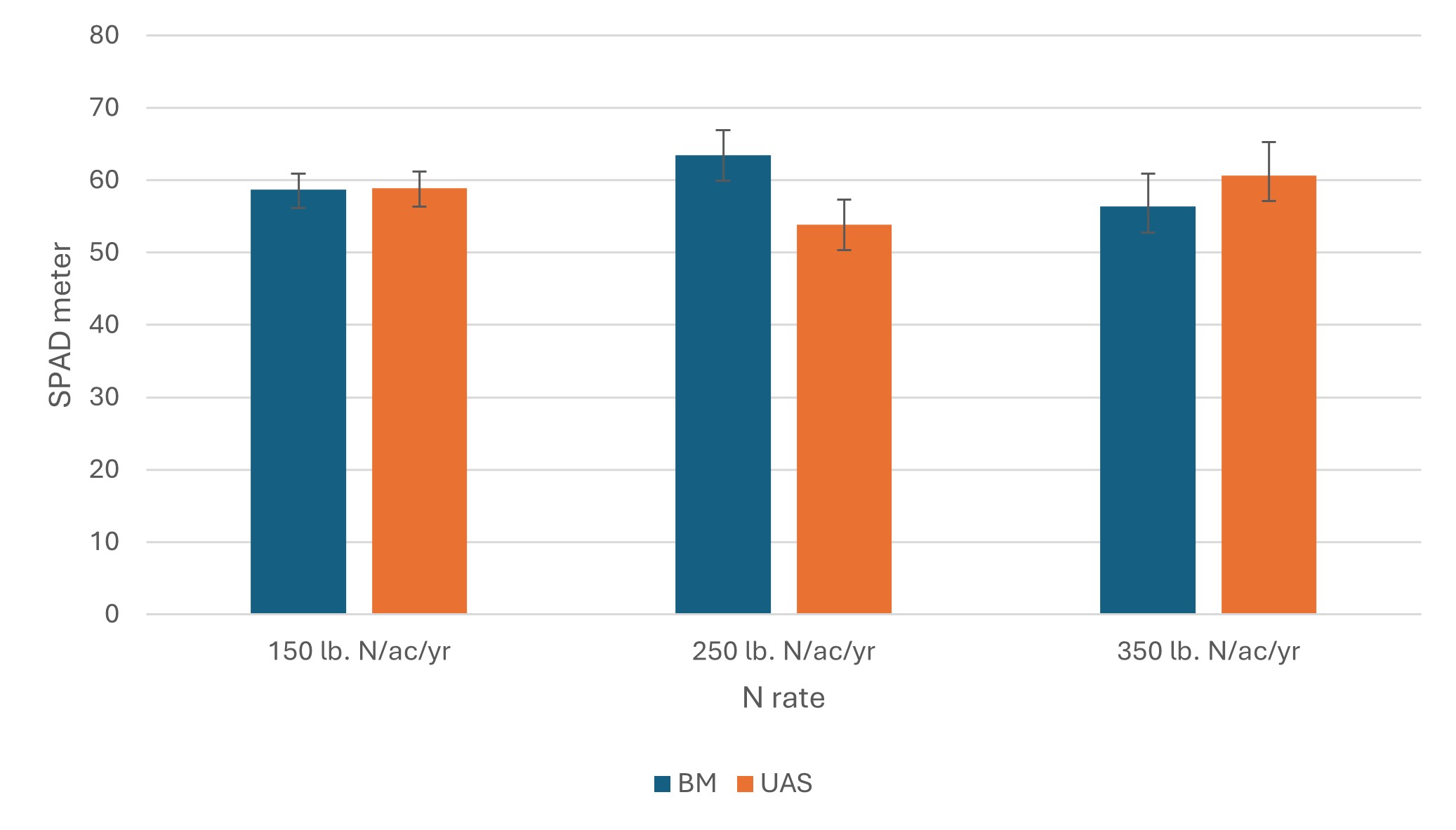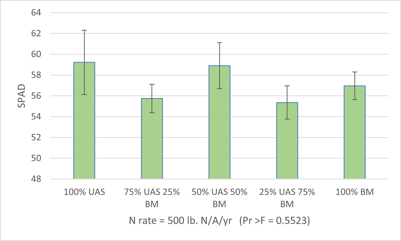 For experiment 2, although we observed some difference in leaf greenness (SPAD) measurement which often indicates different tissue N contents, surprisingly, there is no significant difference in tissue N% among the three N rates and comparing the blood meal to UAS. All treatments resulted in tissue N% ranging from 3.4% to 3.7% at the end of 2023 growing season, from 3.3% to 3.6% at the end of 2024, and 2.8% to 3.1% in August 2025, indicating a significant difference from year to year. Results from other essential elements indicate that leaf tissue sulfur (S, %) and iron (Fe, ppm) were significantly higher in plants treated with UAS than those treated with blood meal across treatment rates (Table 4 and 5).