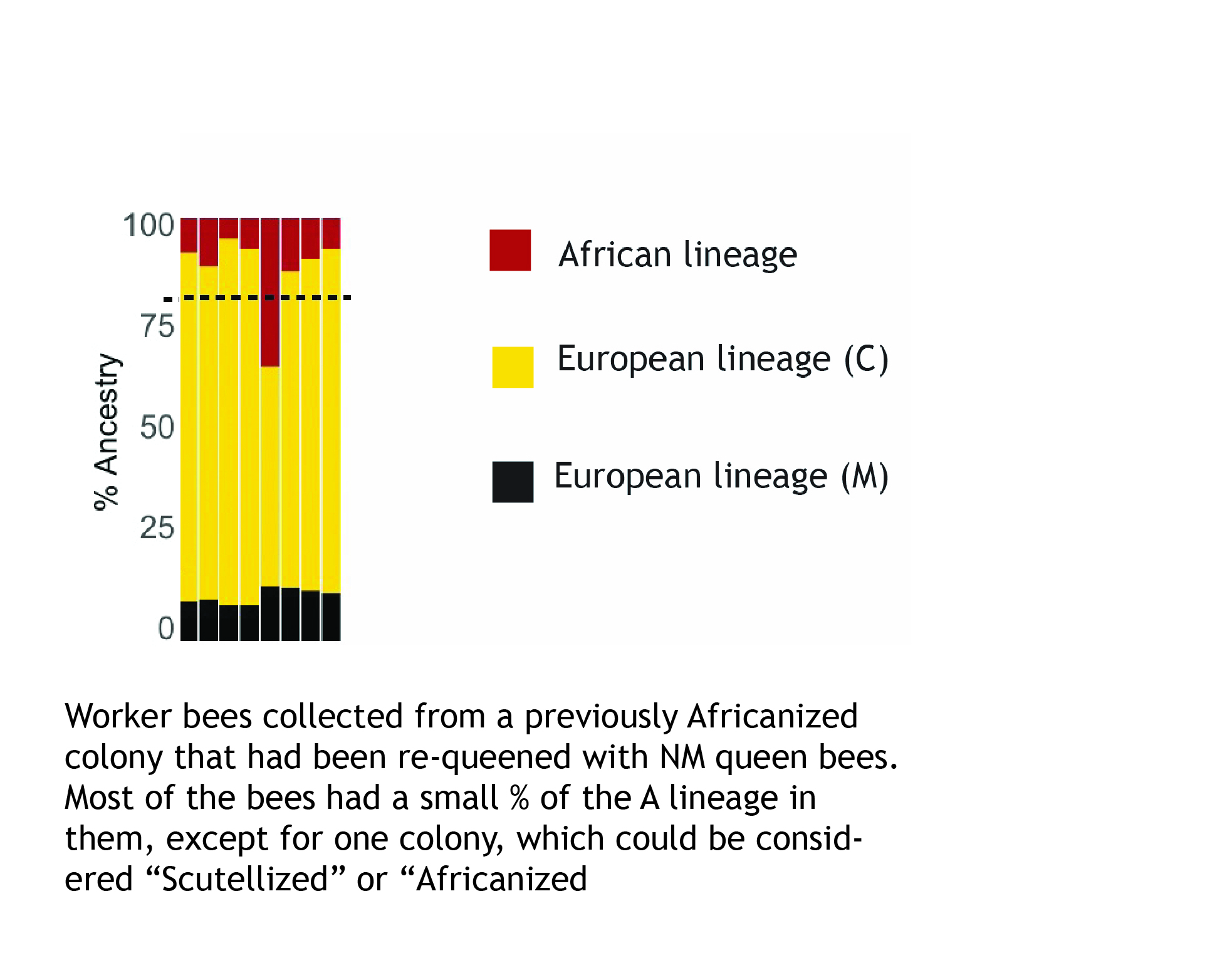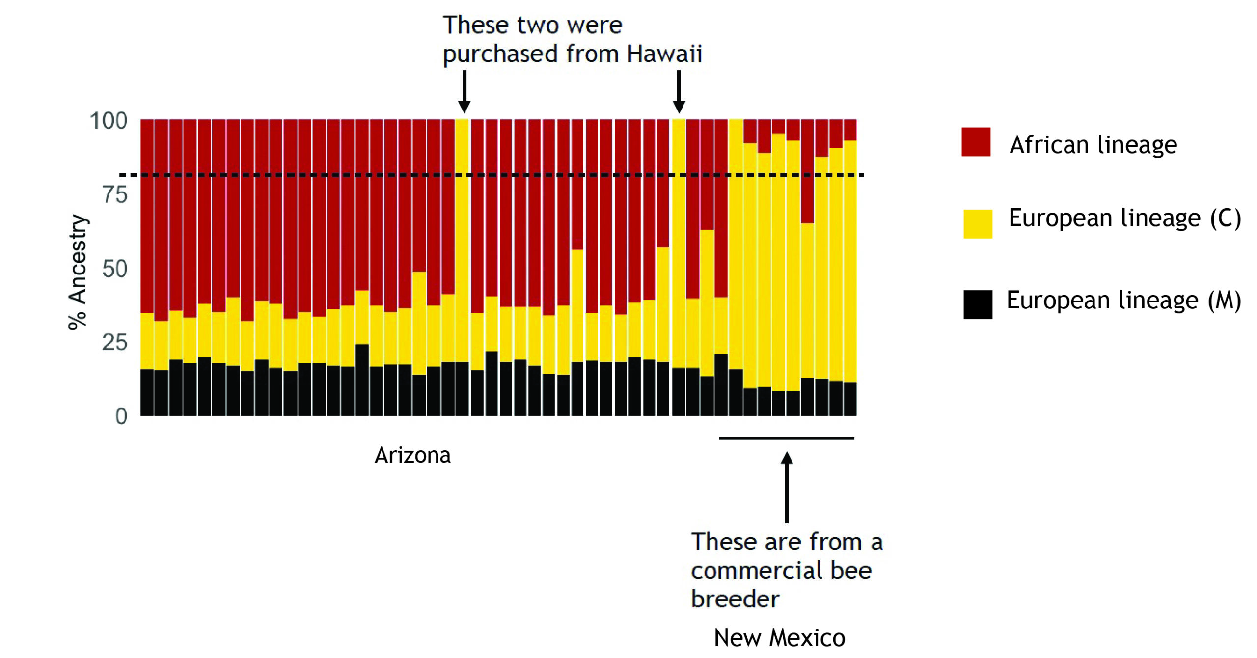 The samples labeled as “New Mexico” originated from queens from NM that were used to requeen the feral AZ colonies that we hived. The queens were obtained with the help of one of the project collaborators. In those samples only 1 worker from NM showed signs of having a significant proportion of African lineage ancestry, suggesting there is some introgression in that population as well.