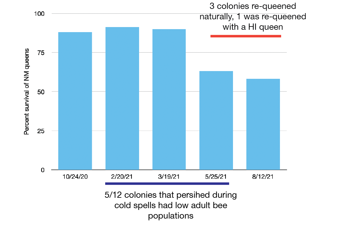Re-queening can only be partially assessed based on the immediate acceptance of the introduced queen. It is important to understand how willing the worker bees are to keep that queen or if they use her eggs to quickly replace her with a queen mated locally, which in this case means a queen with local genetics, and most likely Africanized. Re-queening in early fall in AZ normally meant that colonies would be large, the new queen would not need to go out and mate, since she is already fertilized. Unfortunately, when we tested this we experienced much colder drier winters and suboptimal spring conditions. Consequently, the long term survival assessment of the queens was influenced by those factors. However, when the mortality among the colonies with local stock and the new queens is compared, there was not a statistical difference. Basically it was a hard period for all colonies.