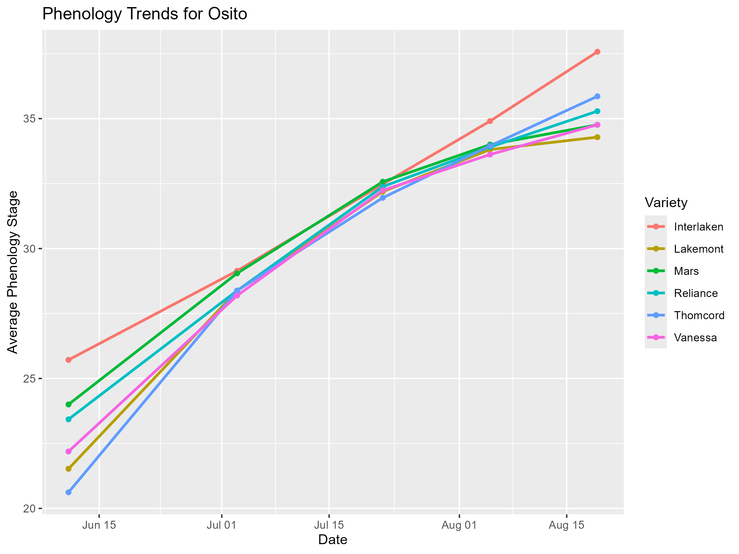 Variety selection for this trial will be based on previous data collected at WCRC-RM and the latest varieties from the University of Minnesota breeding program. Based on previous performance results at WCRC-RM, varieties under consideration are “Einset” (red), “Everest” (blue), “Himrod” (green), “Swenson Red” (red), and “Thomcord” (blue). Pre-releases from the UMN breeding program that show promise for our climate and soil are “MN1296” (red), “MN1369” (green), and “MN1325” (blue). We will also interact with our participant producers to get their input on our variety selection.