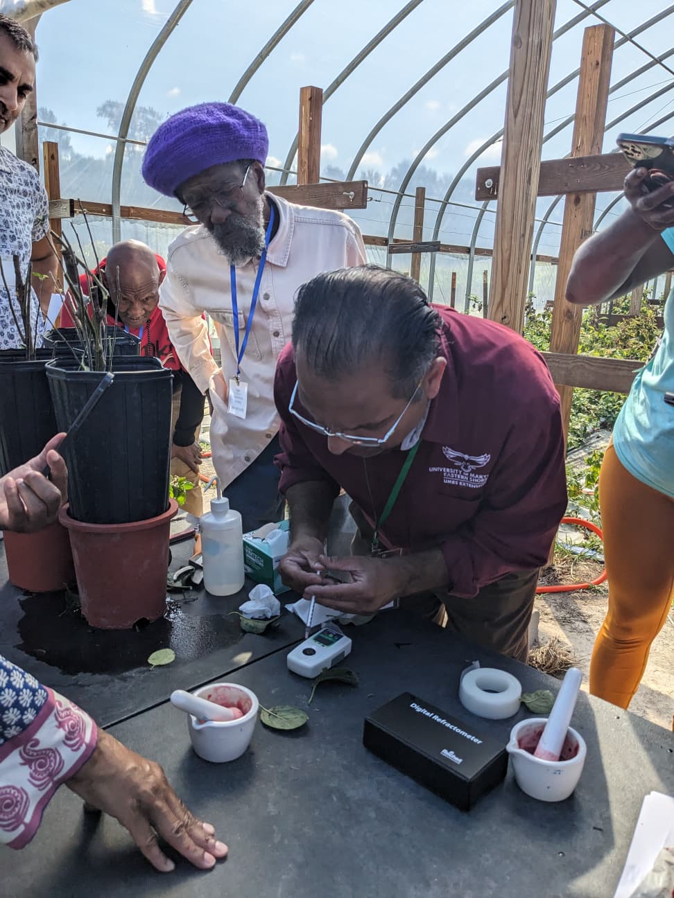 The educational approach centered on multi-year, hands-on training delivered through University of Maryland Eastern Shore (UMES) small-fruit plots and partner sites in Baltimore. Each year, four major workshops were held at key production stages—fall planting of June-bearers, spring establishment of DNS and raspberries, early harvest, and late-season harvest. These were supplemented by additional workshops with TALMAR for veteran farmers. Every educational session combined classroom instruction with field demonstrations in low tunnels, high tunnels, and open beds so participants could observe plant stages, diseases, irrigation needs, and tunnel microclimates in real time. Trainings covered raised-bed preparation, mulching, irrigation scheduling with tensiometers, fertilizer injector use, day-neutral scheduling, primocane and floricane pruning, trellis construction, cane management, disease reduction, and harvest timing. Instruction also introduced refractometers for measuring soluble solids (TSS) and pH meters for acidity, helping growers link fruit maturity to safe and profitable value-added processing. To support ongoing learning, the project produced PowerPoints, factsheets, simple budgets, and online resources.