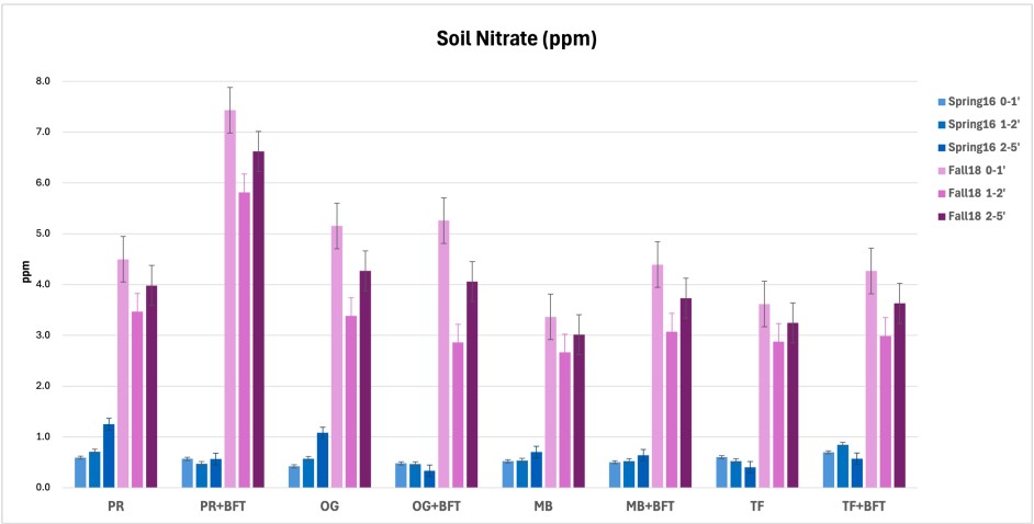 To monitor any potential buildup of soil nitrogen, soil samples to a depth of 30 cm will be collected prior to grazing, and in the fall after the growing season each year. To account for the variability that may result from grazing, ten soil cores will be taken in each plot and combined to make a composite soil sample. Composite soil samples will be analyzed for available nitrogen (NO3-N) using potassium chloride on the Lachat Auto-analyzer, QuickChem Method 10-107-04-1-C.