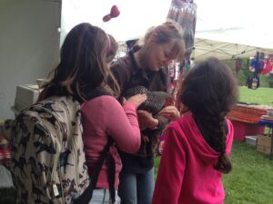 Students at Family Food Fest engaging with one of our farmers (and their chicken)!