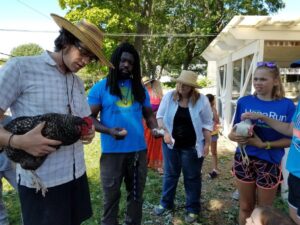Big Muddy Resident Terry Salem provided Youth Gardeners with a lesson on chicken biology and care for week 8. Youth gardeners learned how many eggs a day a chicken lays, chicken anatomy, and what it takes to take care of the chickens. For some youth gardeners, this was the first time holding a live chicken. The chicken lesson was paired up with Lynn the Bee Keeper who brought his observation beehive to discuss bees with the youth gardeners.