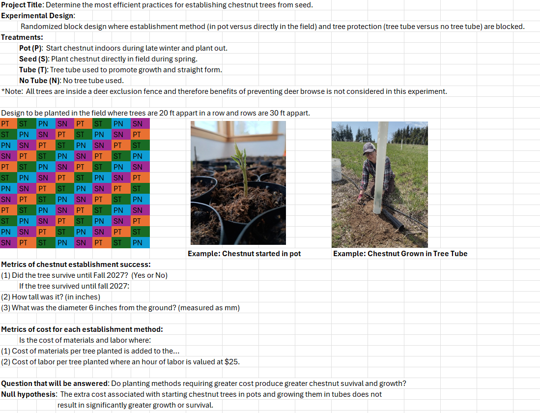 Details: Domestically grown chestnuts are in high demand for food and wildlife and many farmers are working to establish chestnut trees from seed directly at their farm because (1) nurseries can have limited supply of chestnut trees to buy, (2) nursery trees can be expensive with limited shipping options, and (3) nursery trees can be a source of disease (chestnut blight) and pests (chestnut weevils). For example, in 2025, we sold ~30,000 chestnut seeds from our orchard to farmers that were planning to establish new trees. Most people purchasing chestnuts for seed asked us for advice as to how best to establish their seedlings. In our search for an answer, we found that no published quantitative data are available about what methods are best for establishing chestnut trees from seeds. Different people/companies have different advice and suggestions with no systematic evaluation of techniques available. The problem we described for chestnut trees likely also applies to many nut trees planned for wildlife or human food.