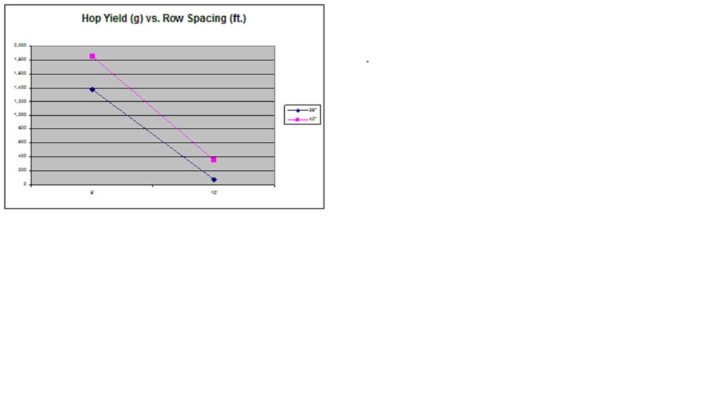 We purchased 400 new Cascade hops. Seven rows were rototilled 5 ft. wide and 100 yds. long. Spacing between rows and between plants was varied as follows, to evaluate the effect of spacing, and the interaction between plant and row spacing: