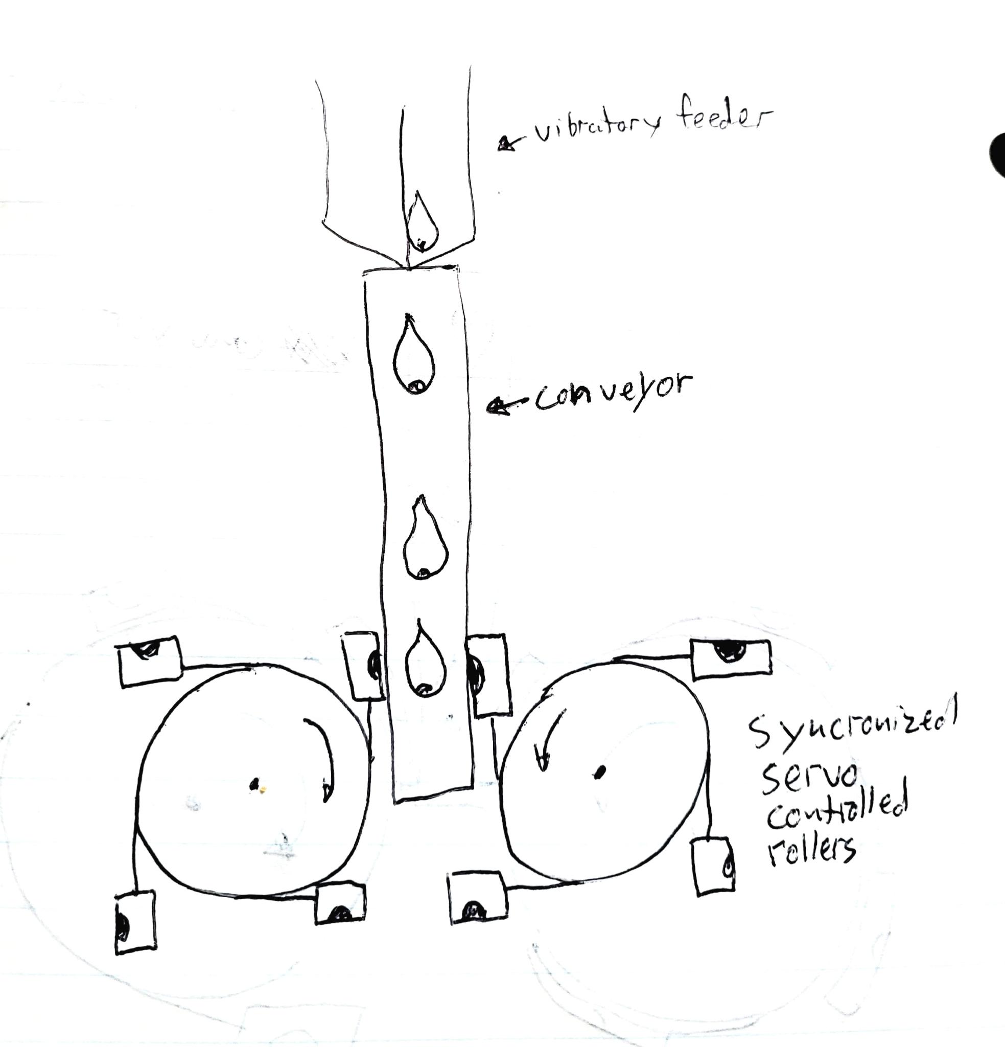 4. Transfer to food-grade pulley: The vibratory feeder transitions the oriented nut onto a small, food-grade pulley moving at a fixed speed.