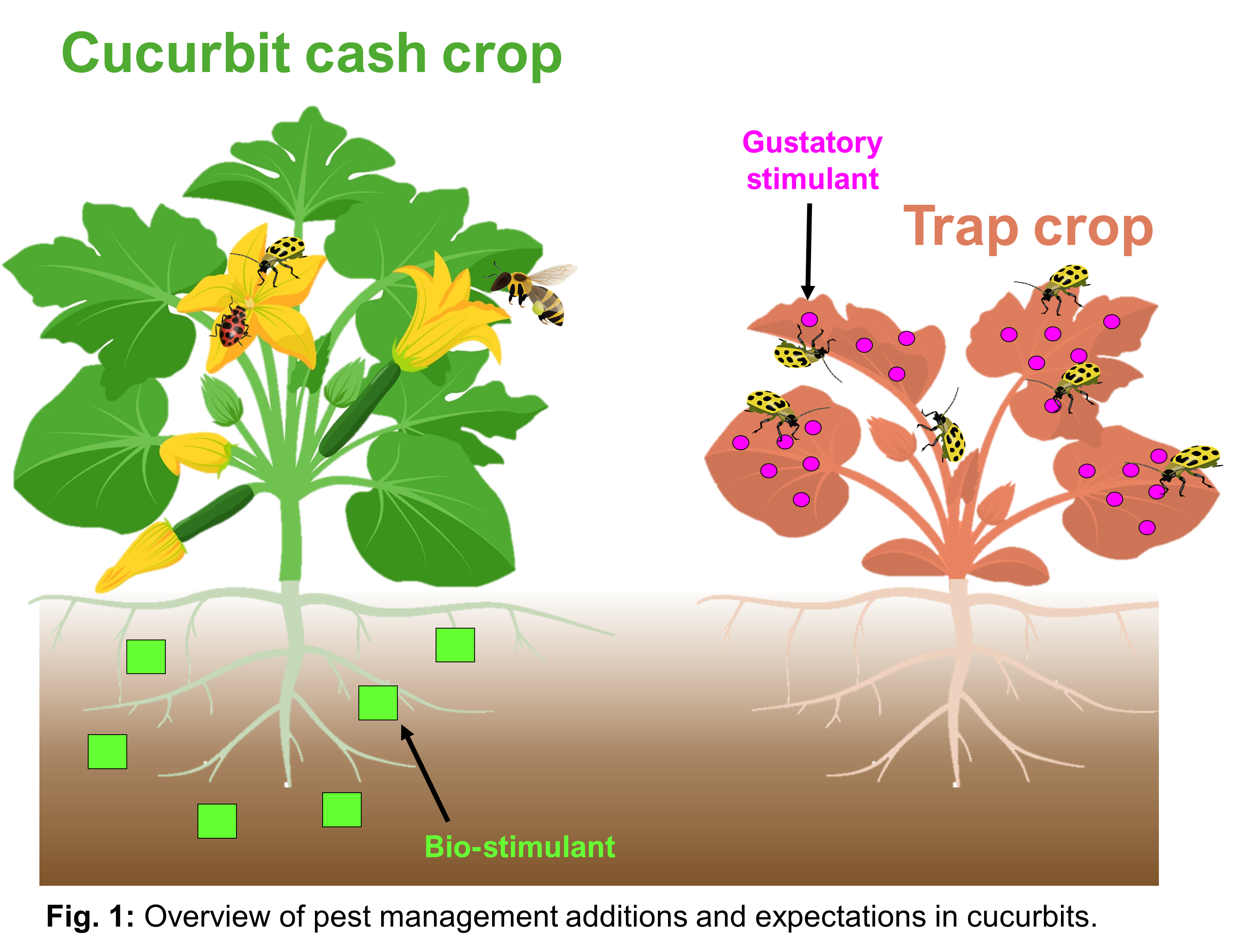 We expect increased understanding in trap cropping orientations (1) and bio-stimulants (2) and combinations of both practices (3) to suppress pest outbreaks in cucurbit production. We also anticipate increasing knowledge of arthropod-mediated ecosystem services (4) within different bio- stimulant and trap crop contexts.